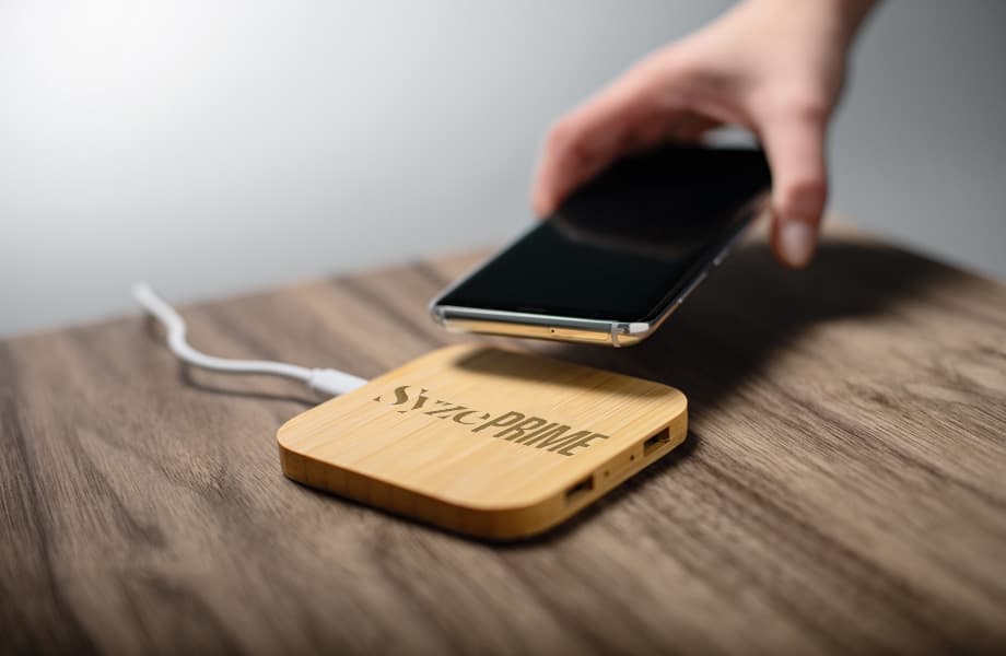 Queste stazioni di carica a induzione sono il connubio perfetto tra tecnologia ultramoderna e sostenibilità. I caricabatteria wireless con elegante rivestimento esterno in bambù consentono di ricaricare senza fili tutti gli smartphone, i tablet e gli smartwatch con tecnologia QI. Inoltre, dispongono di due uscite USB per l’erogazione di energia elettrica. Aggiungi un tocco finale a questi caricabatteria wireless personalizzando la parte superiore della struttura con un’incisione: saranno perfetti come give-away, come simpatica ricompensa per una tombolata o giochi a premi o per completare la tua dotazione da ufficio.