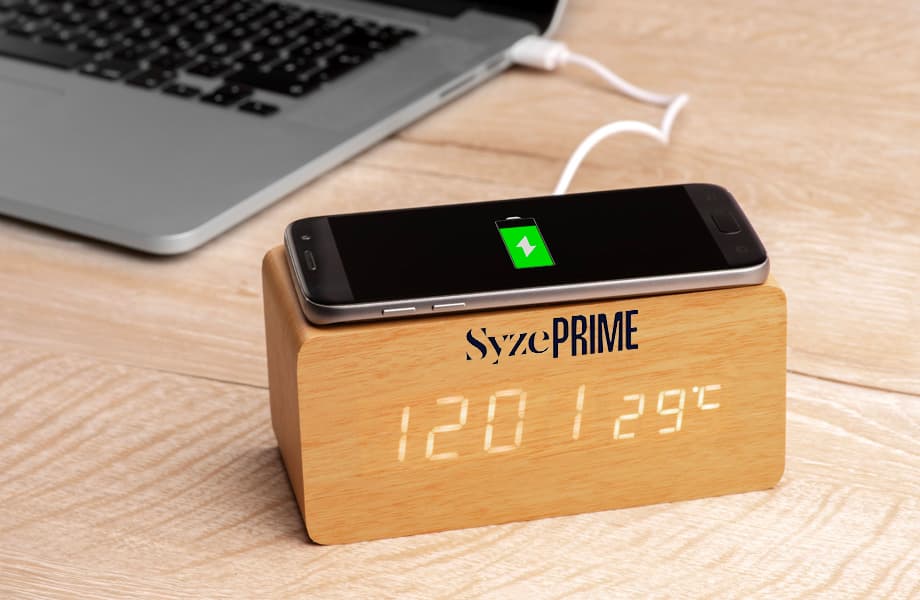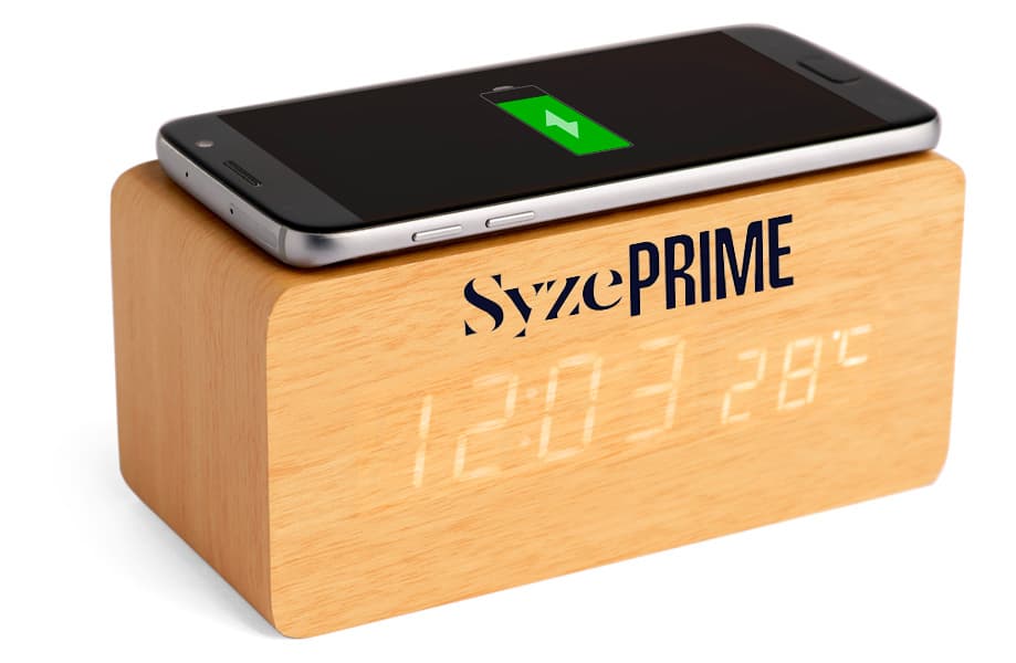 Eleganza e praticità in un unico prodotto: Questi eleganti orologi da tavolo sono segnatempo, termometri e stazioni di ricarica in uno. Il caricabatterie wireless integrato è compatibile con tutti i dispositivi abilitati QI e li carica in modalità wireless in un attimo. Posizionalo semplicemente sopra - fatto! I display digitali illuminano elegantemente la superficie in legno. L'unica cosa che manca è una stampa di alta qualità, che renda gli orologi degli articoli promozionali perfetti per i tuoi clienti e partner commerciali.orologi da tavolo effetto legno con stazione di ricarica a induzionedimensioni: 14,8 x 7 x 7 cmstampabili a 1 coloreArea di stampa al centro sopra al display: 4 x 0,5 cmcompatibili con tutti gli apparecchi predisposti per QIuscita wireless: 5 V, 1 Adisplay digitale: orario e temperatura ambientaleconsegna senza batteriea partire da 10 esemplari Nota: per ogni ordine viene stampato un solo motivo grafico.Non appoggiare oggetti metallici sulla superficie di caricaVai al campione Orologio da tavolo con caricabatteria wireless